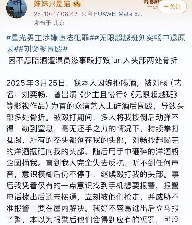 资本护体下的疯狂反扑,尽管刘奕畅火速被刑拘,其团队却上演垂死挣扎。10日,其账号竟"诈尸"更新新剧宣传,粉丝水军集体刷屏"相信哥哥"。更魔幻的是,有神秘人向受害者未婚妻公司施压,要求签"自愿和解书",遭军方介入才未得逞。知情人透露:"这群人至今没道歉,还放话出来要告受害者诽谤。"